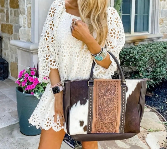 Hand Tooled Leather Cowhide Western Purse Tote Work Bag